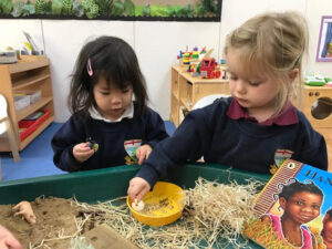 We have been exploring the story Handa’s Hen! The children have been very engaged in learning about farm animals and enjoyed taking part in lots of hands-on activities inspired by the story. In our farm-themed tuff tray, we included woodland animals, sand, and natural materials to encourage the children to explore different textures and use their imagination in play. The children particularly loved using real corn to “feed the chickens,” just like Handa does in the story!