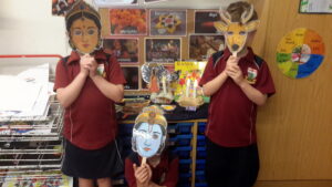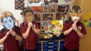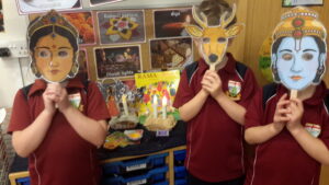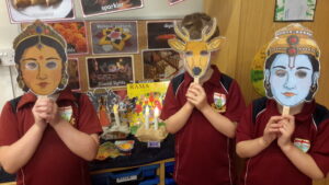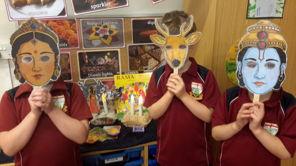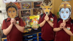The children have enjoyed listening to and acting out the story of Rama and Sita. They were fascinated by the character Ravana with his ten heads and twenty arms. The class have also looked at pictures and short clips showing how Diwali is celebrated around the world, and they were interested in the colourful decorations and joyful festivities.