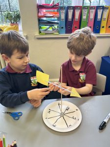 They made predictions about what would happen when the weather vanes were placed in different positions around the school and then tested their ideas by observing how the wind affected them. This hands-on learning helped develop their skills in predicting, observing and testing.