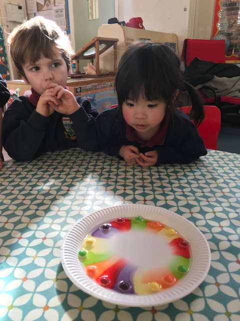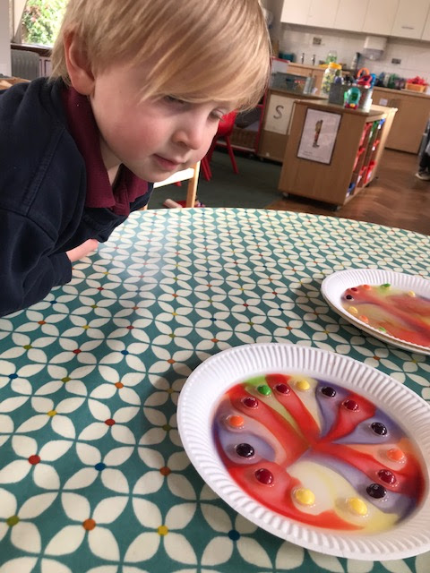 On Tuesday the children really enjoyed mixing skittles with water to see how the colours merged and mixed. We were also thrilled to meet the firefighters and have a look inside the fire engine. The main event was watching the huge jets of water from the hoses!