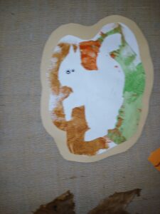 The children used rollers to paint round the outline of squirrels. The end results are very effective. The finishing touch of googly eyes makes all the difference!