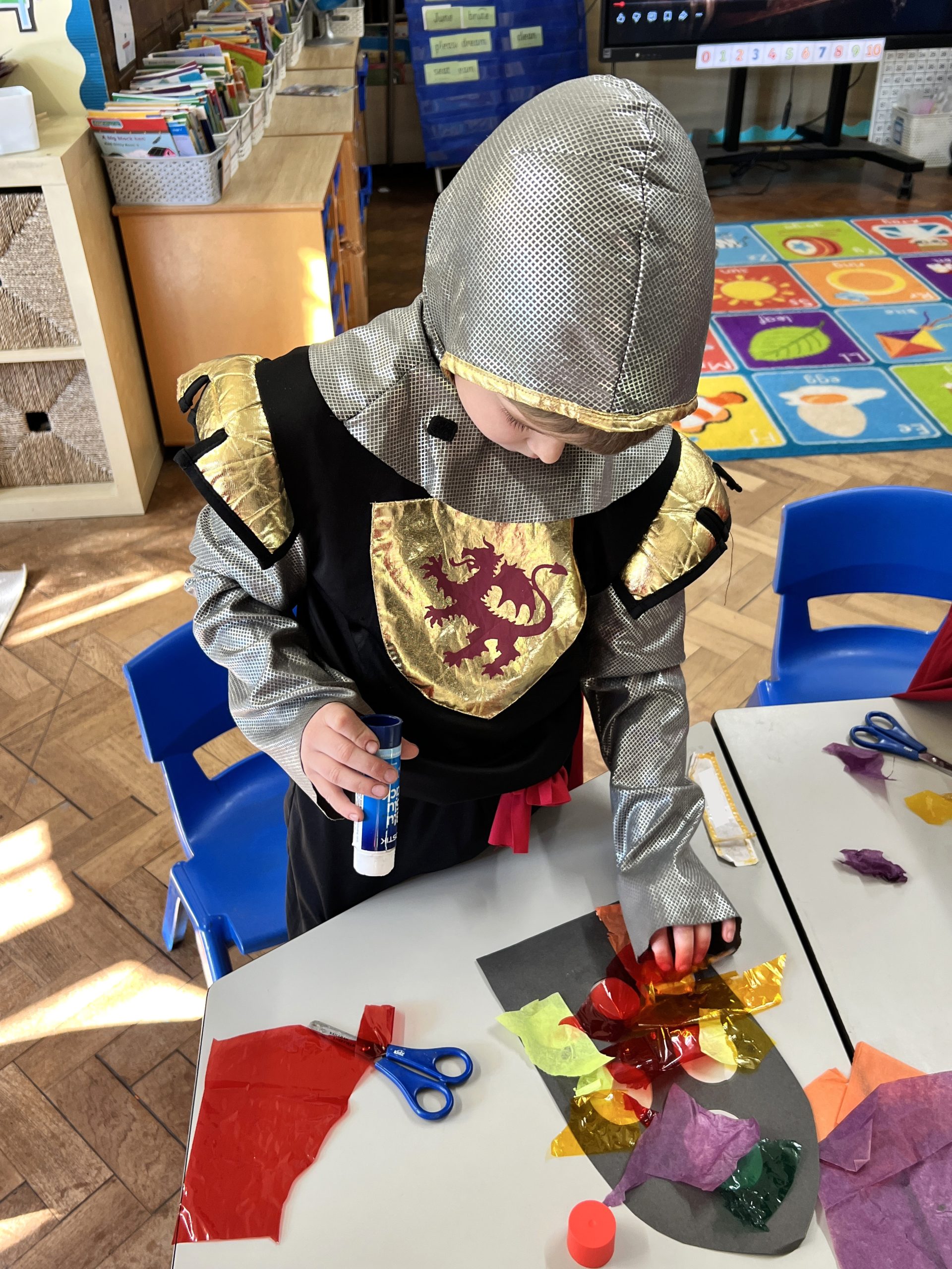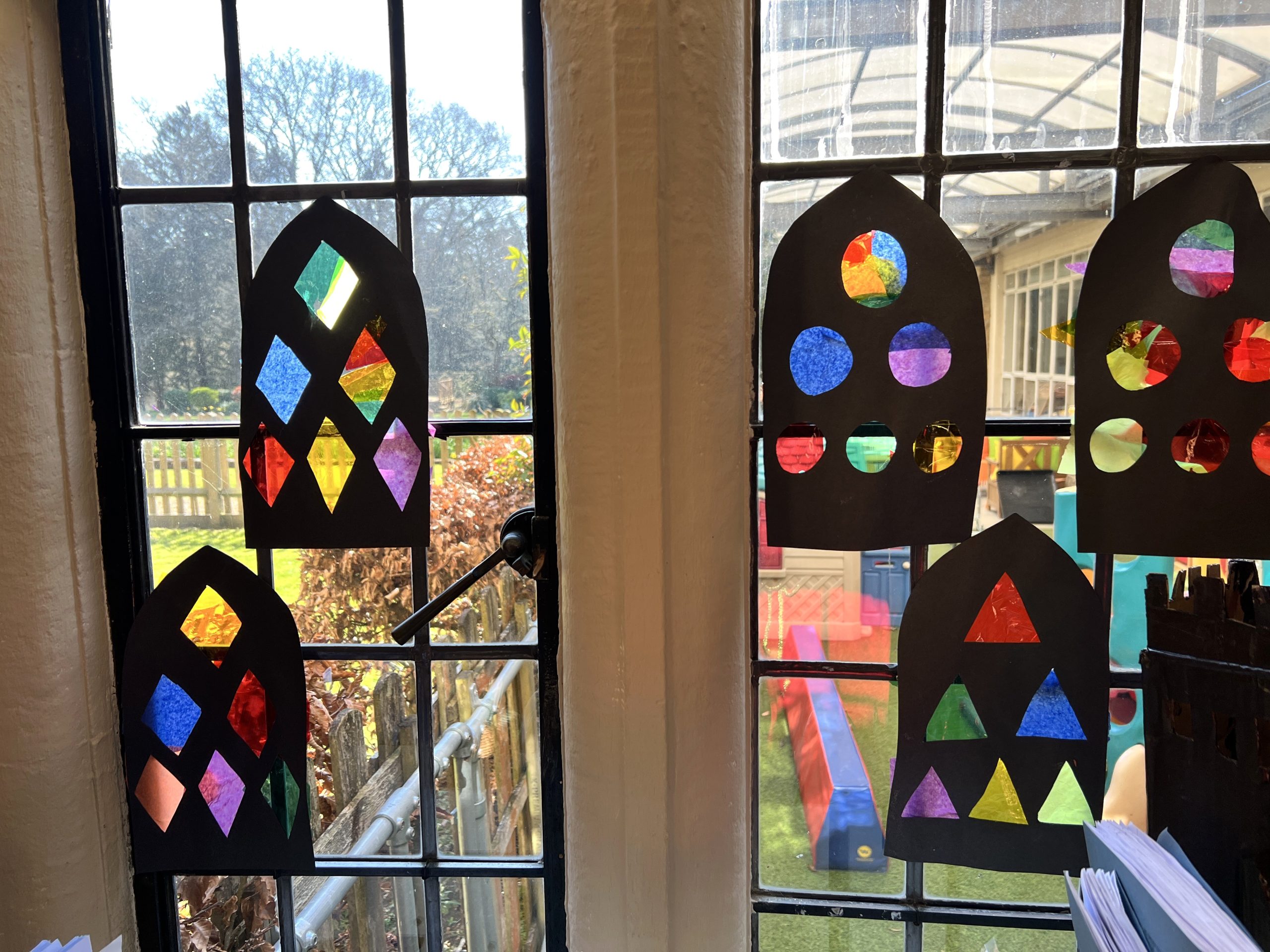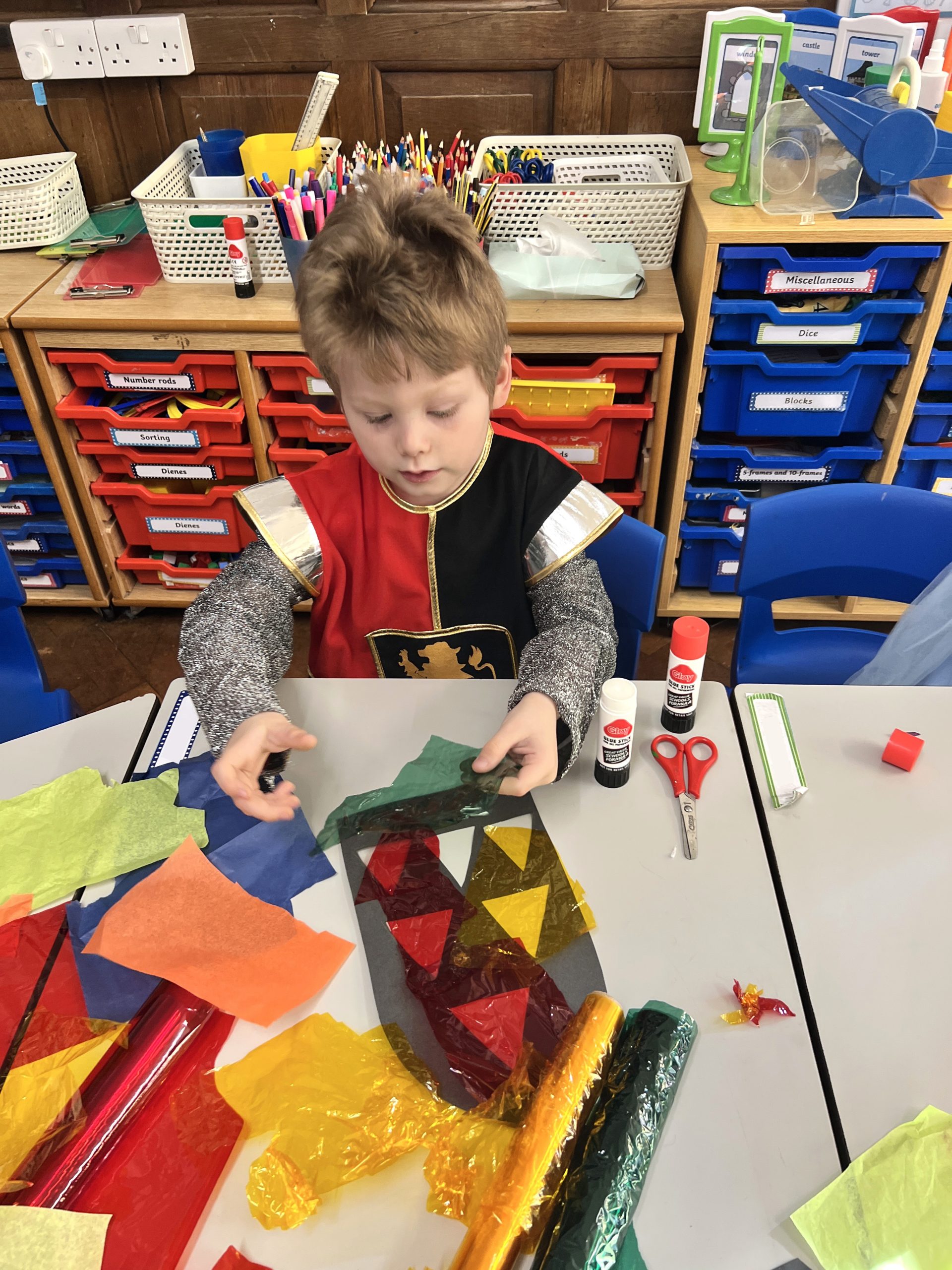 We talked about the beautiful stained glass that can be found in castle chapels. The children used black card, coloured tissue paper and cellophane to make their own stained glass windows.