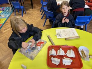Most of the class are going to be angels, so we thought that it would be fun to make some clay angels for Christmas, as a memento. The children carefully wrote out a list of instructions for modelling the clay. Then they rolled out clay to fashion heads, bodies and wings, and completed the look with a tinsel halo. We are looking forward to painting the angels next week when the clay has dried, and seeing the finished models.