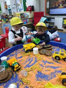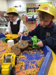 The children have also enjoyed a harvest themed tuff tray. The children wore hard hats as they used diggers and spoons to transfer lentils and pasta. It was fantastic watching their interactions and ideas develop.