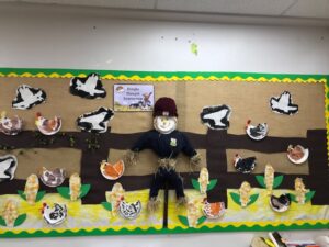 There are paper plate chickens, fabric sweetcorn and fabulous silhouette crows to keep the scarecrow company.