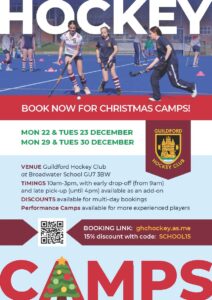 Hockey camps at Guildford Hockey Club during the Christmas holidays are fast approaching, (22nd, 23rd, 29th & 30th December). They are running from 10am – 3pm and are currently offering a 15% discount with code SCHOOL15 when you book via this link.