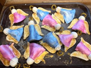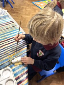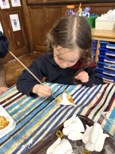 The children were very excited to start painting their ornaments, choosing lovely gold and metallic pastel paint. They sat quietly, painting in the wings and dresses, taking great care over their creations.