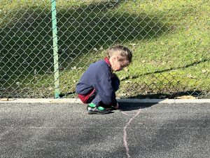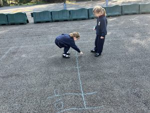The children are learning to estimate numbers on a number line to 50, so armed with big sticks of chalk, we headed up to the hard court. They drew various different number lines with their chalk, such as 20 to 40, learnt how to find the midpoint, and how to estimate various different numbers on the number lines.