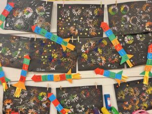 Our creative activities have been full of colour and imagination. The children have made some beautiful firework artwork, now on display in our classroom. Using paint, glitter and collage materials, they created night skies filled with rockets and bursts of colour. We have also been practising our firework words in writing and moving our bodies like fireworks, dancing, twirling and popping across the room.