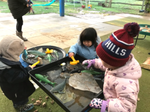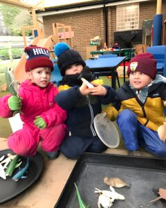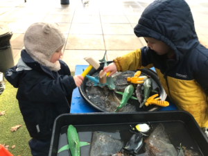 The Kindy and Nursery children have made the most of the freezing weather conditions and enjoyed outdoor science by choosing some sea creatures and put them in tuff trays full of water. The water froze overnight leaving the sea creatures trapped in the ice. The children used a variety of different methods to break the ice with some using cold and warm water while other children used items from the tool kit to chip, saw and hammer the ice. Another great idea was to syringe water over smaller sections of the ice.